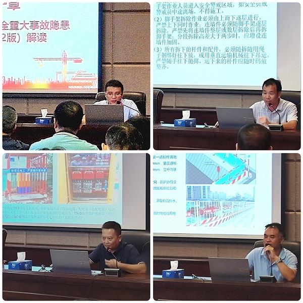 會上,安全總監(jiān)李雪偉同志解讀了房屋市政工程生產(chǎn)安全重大事故隱患判定標(biāo)準(zhǔn)(2022版),并講解了應(yīng)急突發(fā)事件救援程序和控制要點(diǎn),以及施工人員預(yù)防高溫中暑的措施;第三分公司安全經(jīng)理戴海華同志講授了外腳手架工程施工安全技術(shù)及措施;安全科副科長黃海雄同志講解了在安全檢查中發(fā)現(xiàn)的施工現(xiàn)場安全用電存在的問題及整改措施;深圳分公司安全經(jīng)理黃奇峰同志宣講了“三寶、四口、五臨邊”安全防護(hù)的規(guī)范做法。